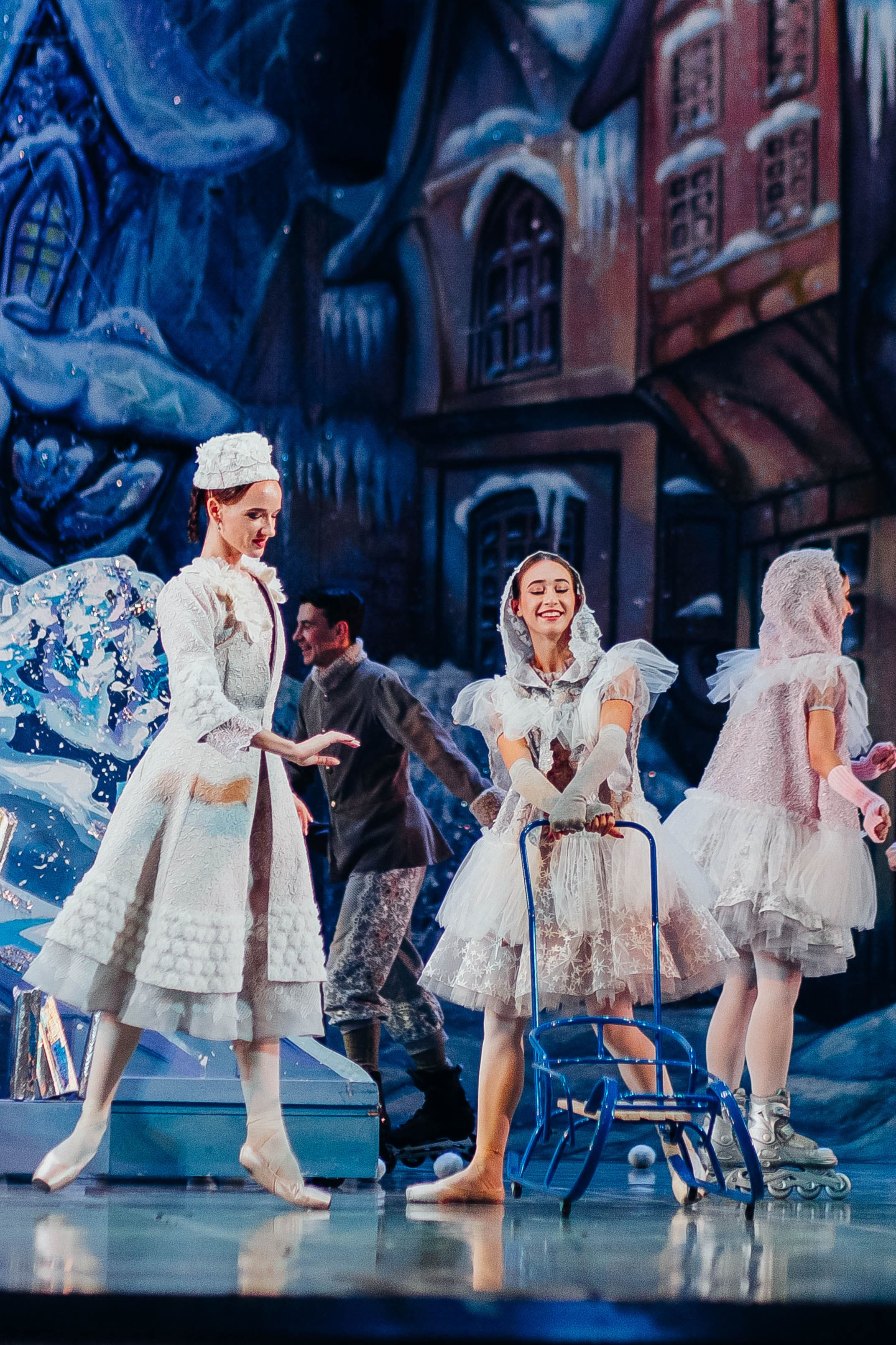 In the street, where a blizzard rages, Kaj sees a charming woman in a snow-white dress. This is the Snow Queen accompanied by evil trolls. Having fallen under her spell, the boy forgets about Gerda. Like in a dream, Kaj sits in the Queen’s crystal sleigh, rising high into the sky.